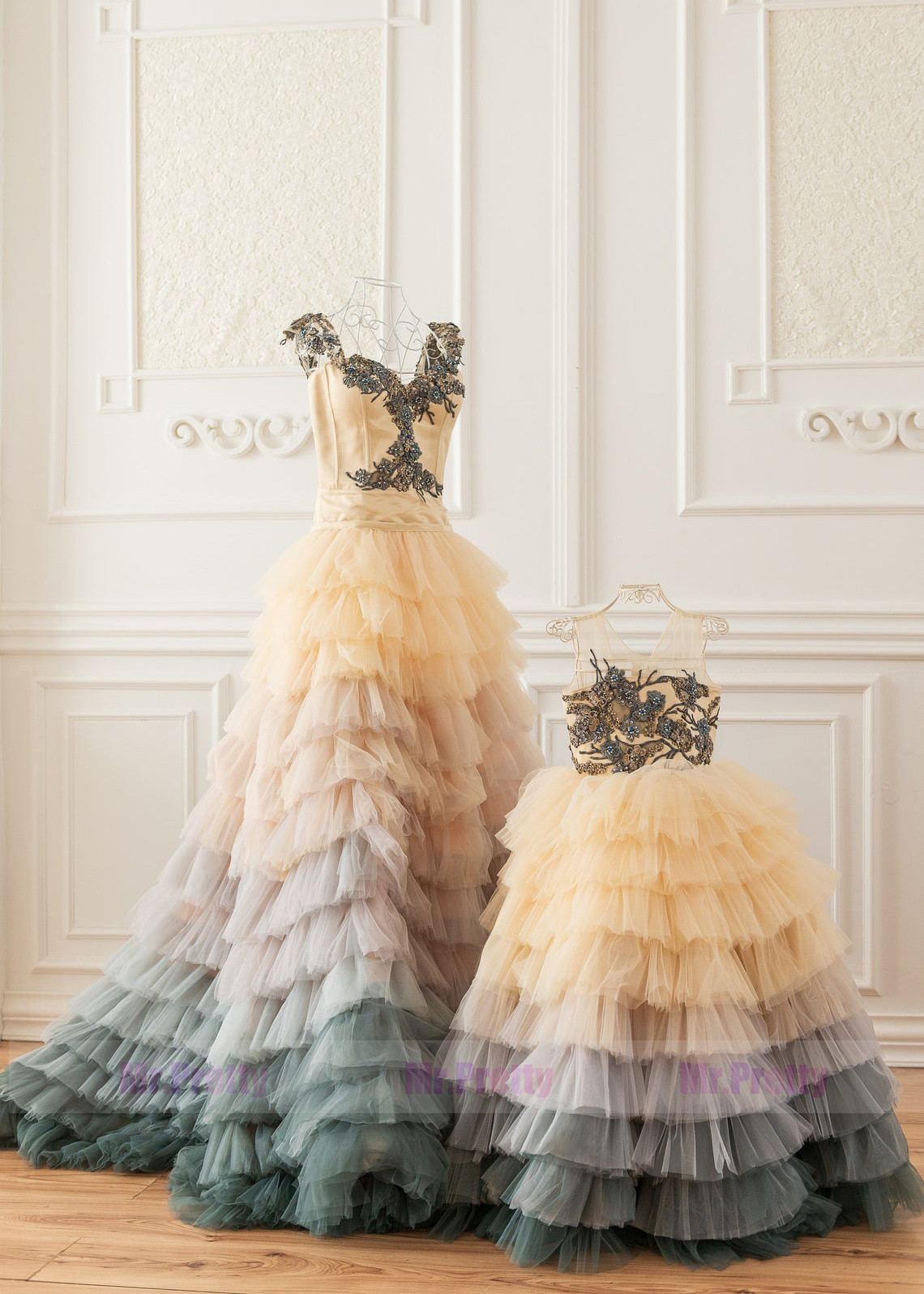 Colorful Beaded Lace Short Train Mother and Kids Dress