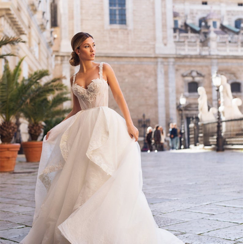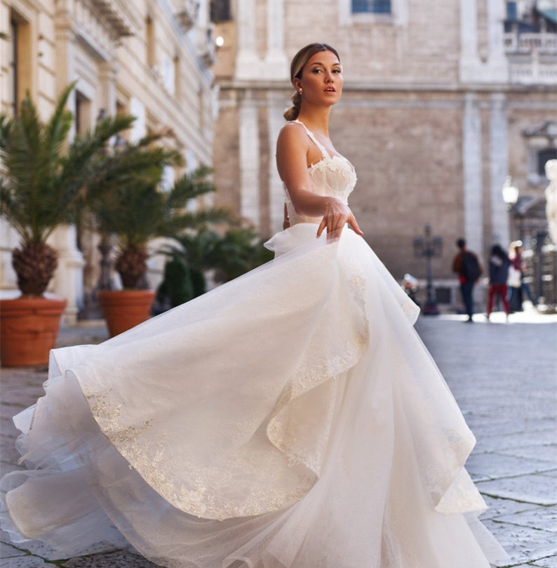 Ivory Lace Tulle Short Train Bridal Gown Wedding Dress
