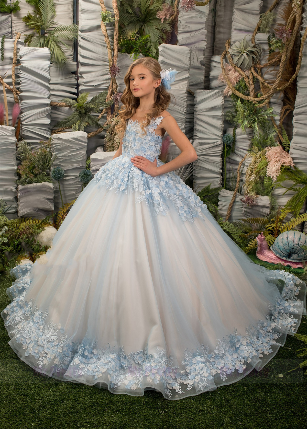 Light Blue Floral Tulle Lace Girls Pageant Dress