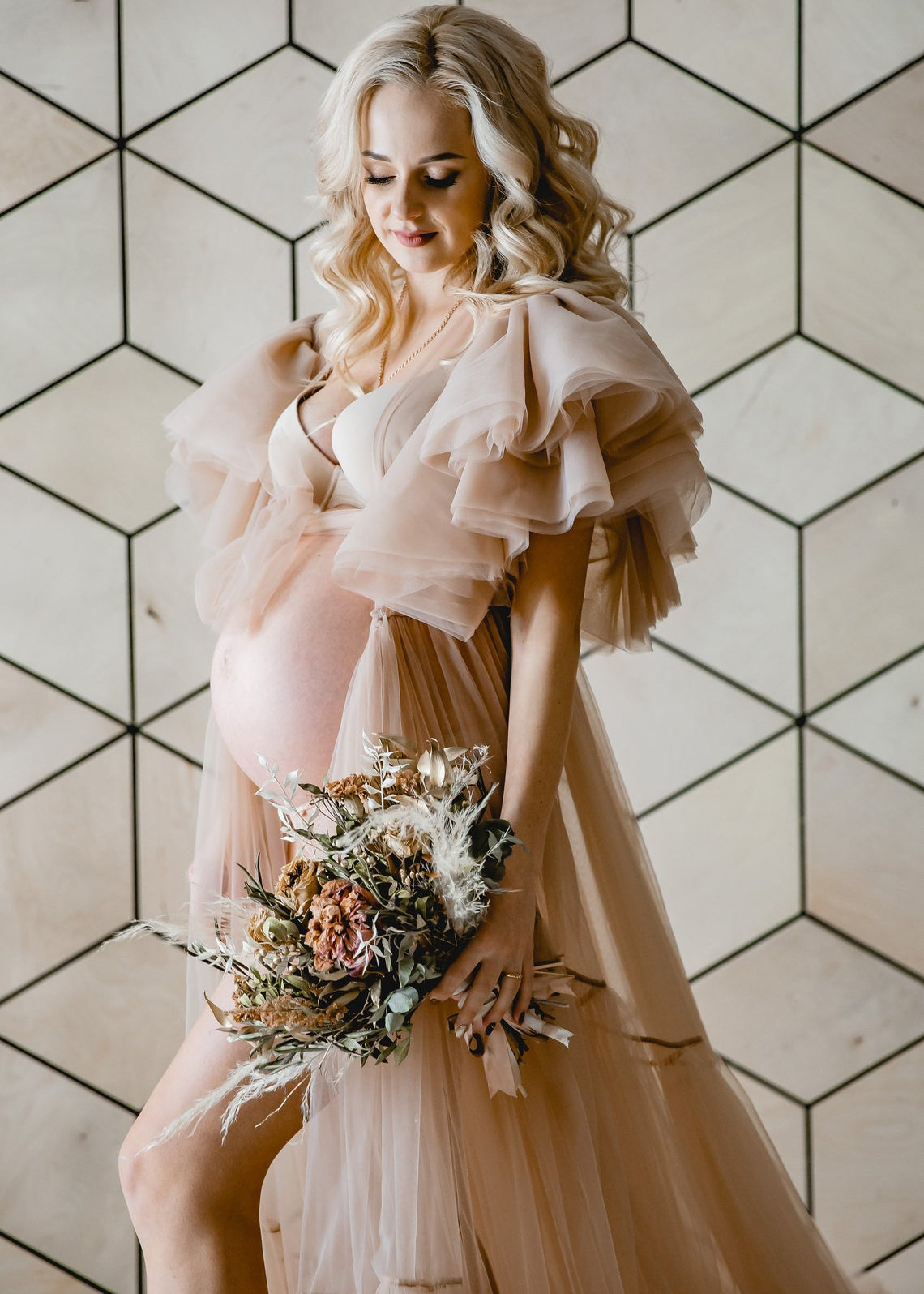 Blue/Tan Tulle Flutter Sleeves Open Front Maternity Dress for Photoshoot